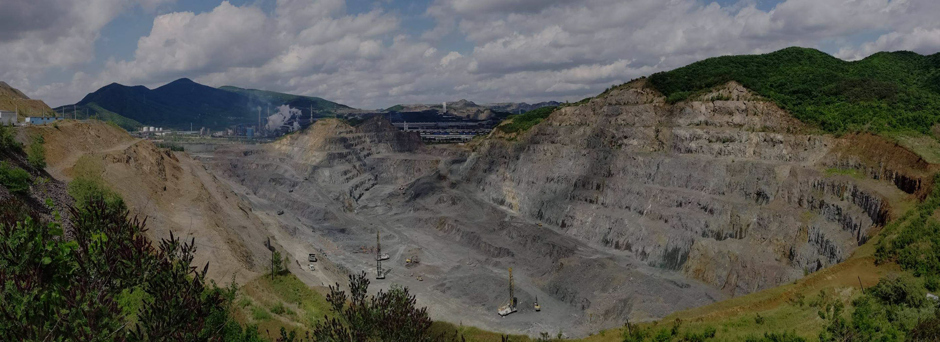 礦料自四周高處開采出來,經裝載機裝載后,由9輛自卸斗重卡運送至南部半山腰的的卸貨等待區